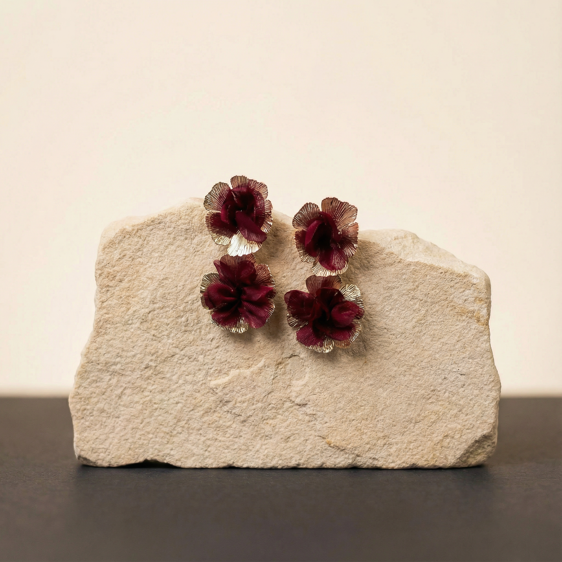 Maak kennis met onze Red Flower Earrings: grote gouden eyecatchers met dubbele bloemvormen, subtiel gevuld met rode stof. Een unieke combinatie van elegantie en lef gemaakt om harten sneller te laten kloppen.